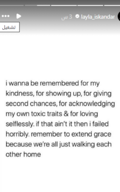 فيما نشرت منشوراً آخر تعبّر فيه عن رغبتها في أن تُذكر بطيبتها وصفاتها الحسنة، حيث قالت: "أريد أن أُذكر بطيبة قلبي، بوجودي إلى جانب الآخرين، بمنحي للفرص الثانية، باعترافي بعيوبي، وبحبي غير المشروط. إن لم يكن هذا هو السبب، فقد فشلت فشلاً ذريعاً. تذكروا أن تمدوا أيديكم للآخرين، فنحن جميعاً في هذه الرحلة معاً."