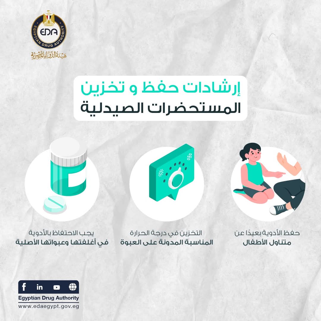 وانطلاقًا من هذا، تقدم هيئة الدواء المصرية عبر صفحتها الرسمية بموقع التواصل الاجتماعي الفيسبوك بعض الإرشادات الضرورية لضمان التخزين السليم للمستحضرات الصيدلية: