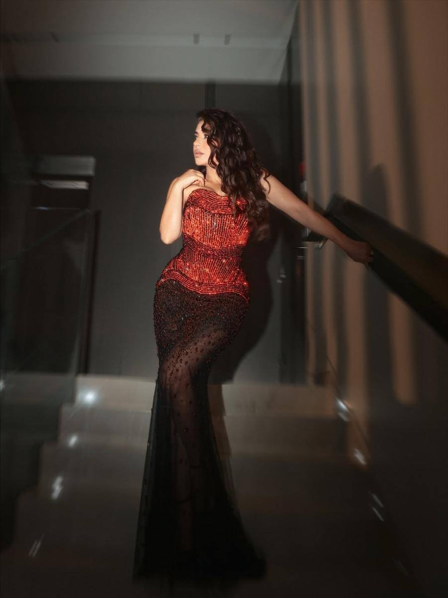 • تألقت ساشا دحدوح بفستان حورية البحر باللونين الأحمر والبرتقالي من شربل زوي، مطرز بالكامل مع صدر مكشوف على شكل قلب، وزيّنته بمجوهرات من Yeprem.