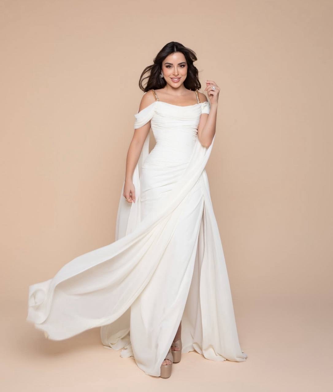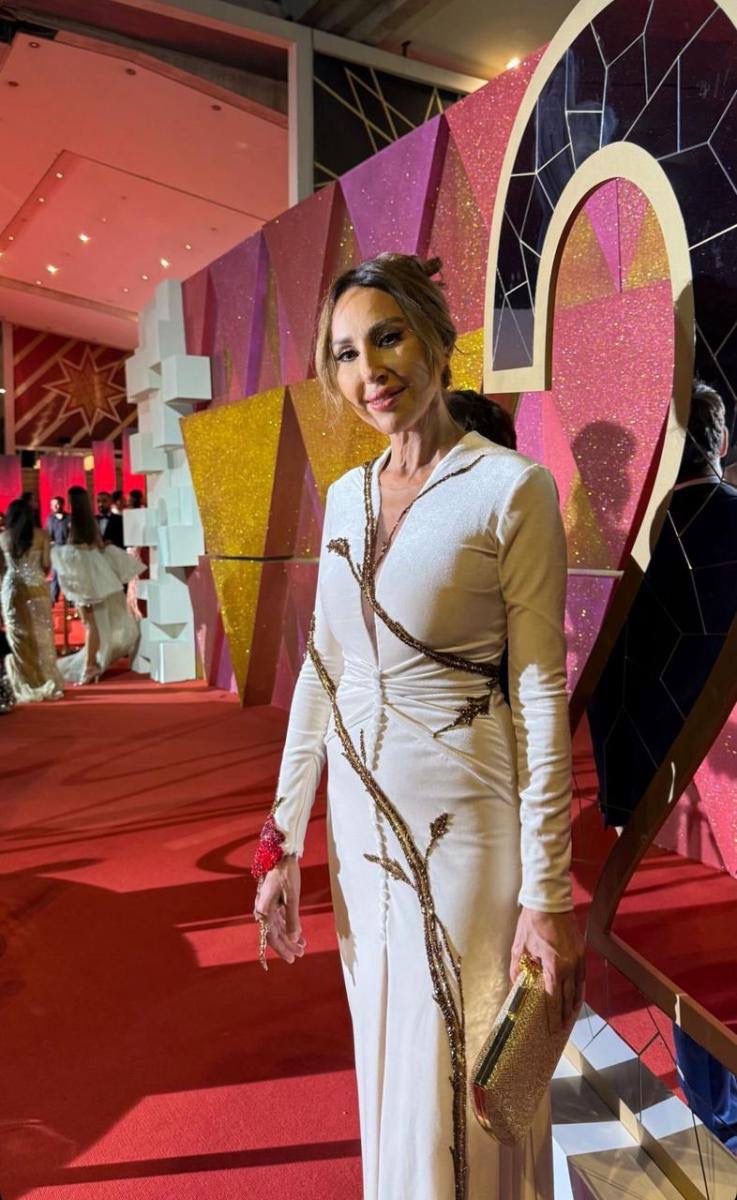 • أطلت ورد الخال بفستان أبيض مزدان بتطريزات ذهبية وبرونزية، مع أزرار على الخصر وفتحة أمامية أنيقة منحتها مظهراً ساحراً.