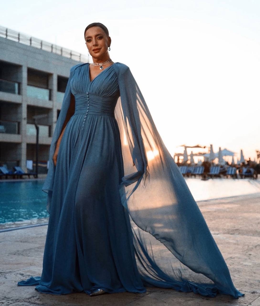 • أما شكران مرتجى فاختارت الأزرق الهادئ بفستان ذي ياقة على شكل V وأزرار على الخصر، ترافقه تنورة واسعة وأكتاف بتصميم الكاب حملت نفحة شرقية.