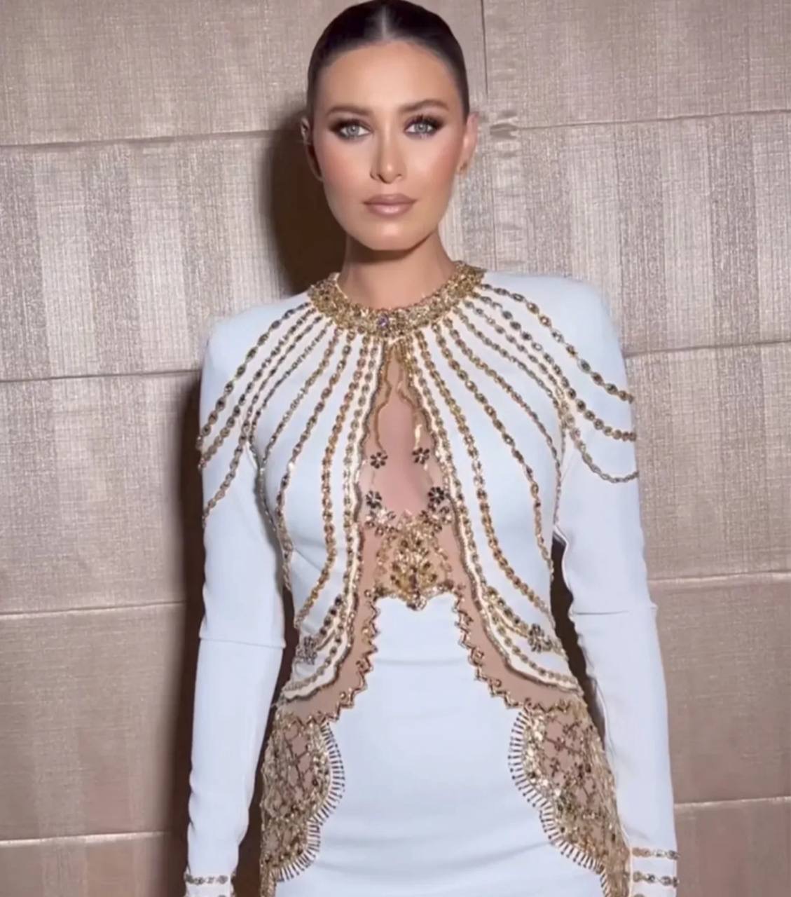 • اختارت ندى كوسا فستاناً أبيض ضيقاً من رامي سلامون، مزيّن بتطريز فضي عند الصدر والخصر، عكس أناقة فاخرة.