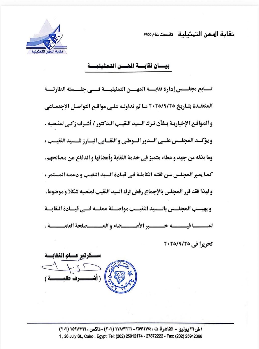 عقد مجلس نقابة المهن التمثيلية، والذي يرأسه أشرف زكي، اجتماعًا طارئًا يوم 25 سبتمبر 2025 لمناقشة ما تم تداوله عبر وسائل التواصل الاجتماعي وبعض المواقع الإخبارية بشأن قرار الدكتور أشرف زكي، نقيب الممثلين، تقديم استقالته من منصبه.