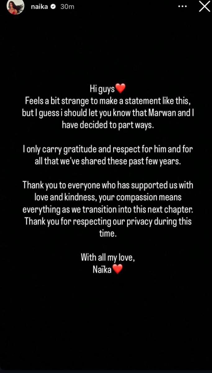 أما نايكا، فأكدت المشاعر ذاتها بقولها: “قد يبدو الأمر غريبًا بعض الشيء أن أشارك هذا، لكنه مهم. سانت ليفانت وأنا قررنا الانفصال. أشعر بامتنان واحترام كبير له ولكل ما جمعنا. شكرًا لكل من أحاطنا بالحب واللطف، فدعمكم يعني الكثير ونحن نبدأ هذا الفصل الجديد.”