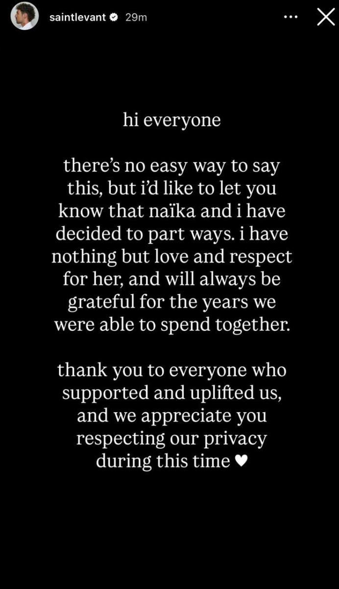 وجّه سانت ليفانت رسالة مباشرة إلى جمهوره قال فيها: “هذا الأمر ليس سهلًا، لكن أود إخباركم أنني ونايكا قررنا الانفصال. لا أحمل لها إلا كل الحب والاحترام، وسأظل ممتنًا للسنوات التي جمعَتنا. شكرًا لكل من دعمنا، ونقدّر احترامكم لخصوصيتنا في هذا الوقت.”