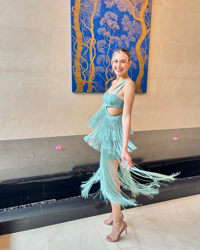تألقت بفستان من توقيع Hau de Gamme تميّز بقصّته الانسيابية وتفاصيل الشراشيب التي منحت الإطلالة حيوية وأناقة متجددة.