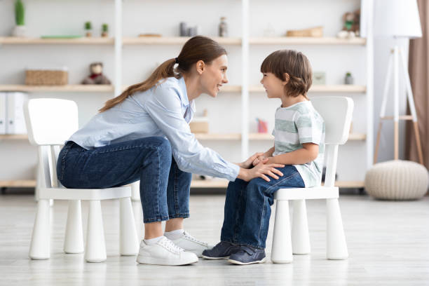 يتم توجيه الطفل بدون عصبية بالنزل إلى مستوى نظره والتحدث معه بهدوء مع التركيز على الفعل لا على الطفل، مع عدم الإساءة له بالألفاظ.