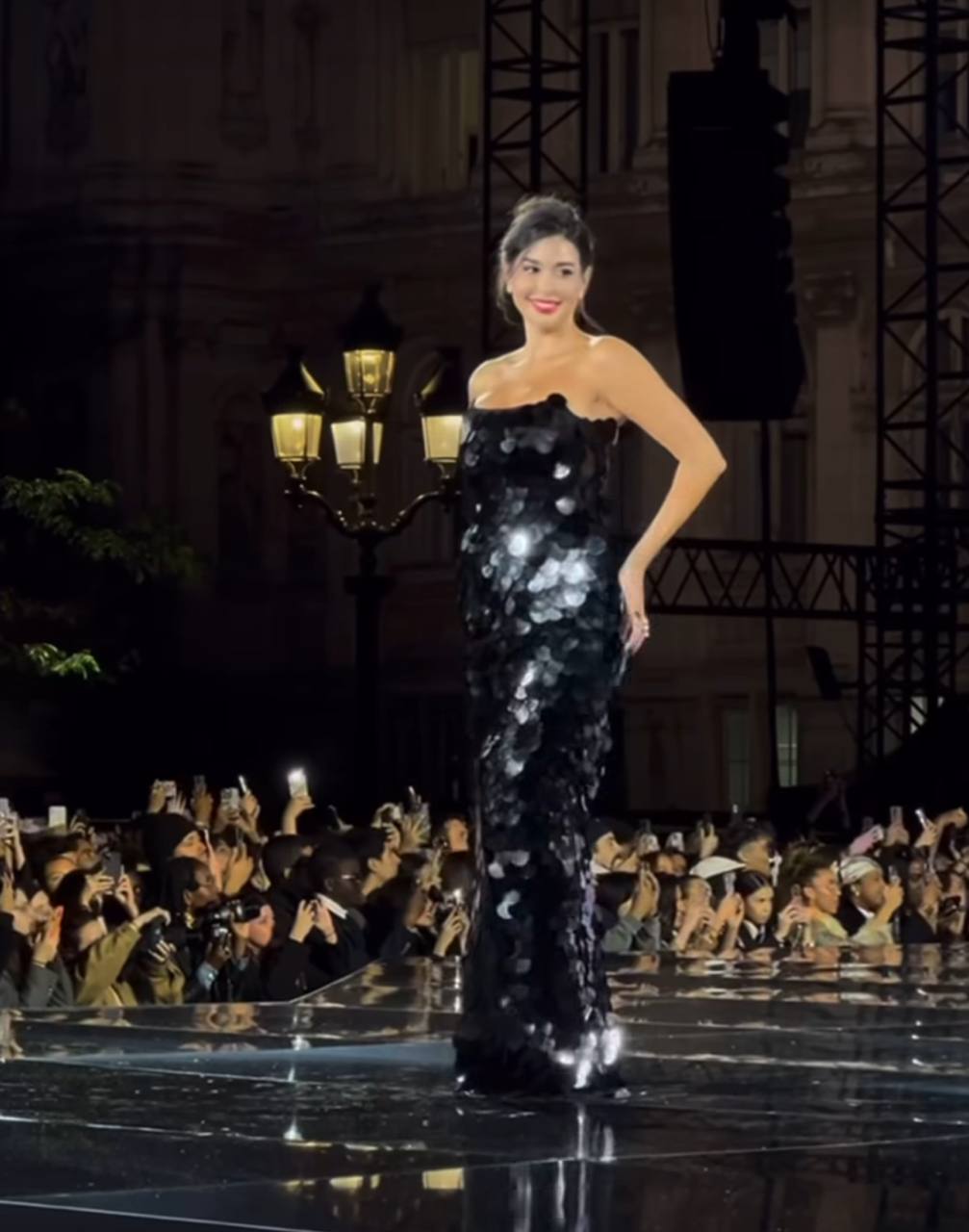 ولم تكن هذه إطلالتها الوحيدة خلال أسبوع الموضة في باريس، إذ تألقت أيضاً في عرض مع لوريال باريسبفستان أسود لامع ضيّق وطويل من دون أكمام.
