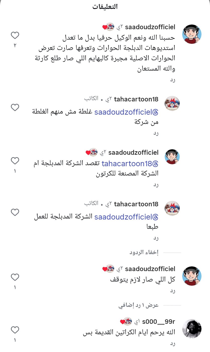 فيما أثار الأداء الصوتي والحوار في النسخة المدبلجة من كرتون شهير استياءً واسعًا، إذ رأى كثيرون أن الدبلجة الجديدة نُفذت بعيدًا عن استوديوهات الدبلجة العربية المعروفة، ما سمح – بحسبهم – بتمرير عبارات ومشاهد لا تتناسب مع ثقافة المنطقة.