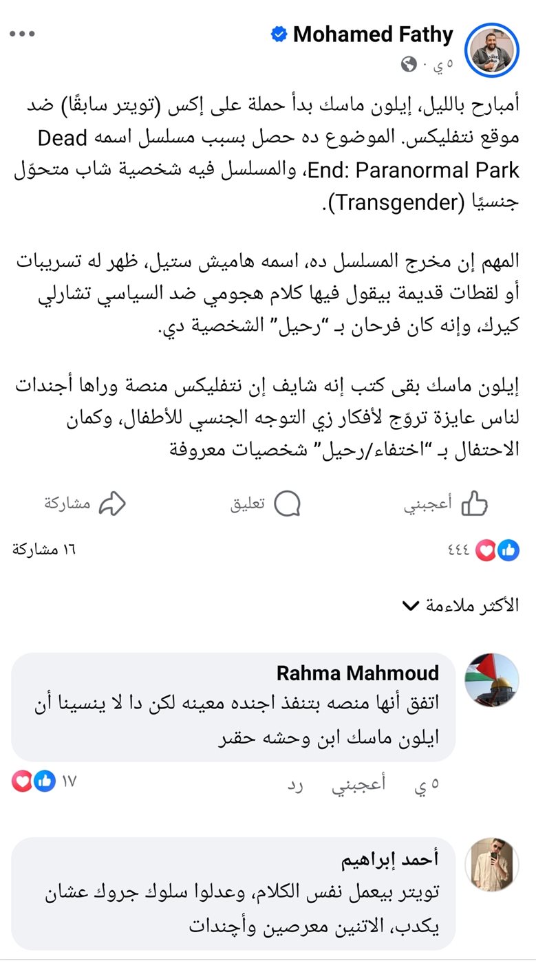ولم يقتصر الجدل على الجمهور العربي، بل وصل إلى الساحة العالمية، حيث تفاعل رجل الأعمال الأميركي إيلون ماسك مع الأزمة الخاصة بمحتوى كرتون شهير عبر منصته «إكس»، داعيًا إلى مقاطعة نتفليكس، وكتب في منشور: «ألغوا نتفليكس حفاظًا على صحة أطفالكم».