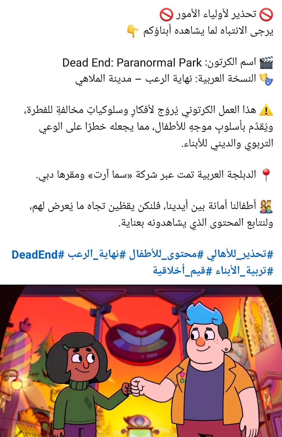 أشعل مسلسل الرسوم المتحركة الأميركي كرتون «Dead End: Paranormal Park» موجة غضب واسعة في الأوساط العربية، بعد انتشار مقاطع مدبلجة بالعربية وُصفت بأنها مسيئة للقيم الدينية والاجتماعية، لاحتوائها على مشاهد وشخصيات تُروّج لأفكار غير مقبولة في المجتمعات العربية.