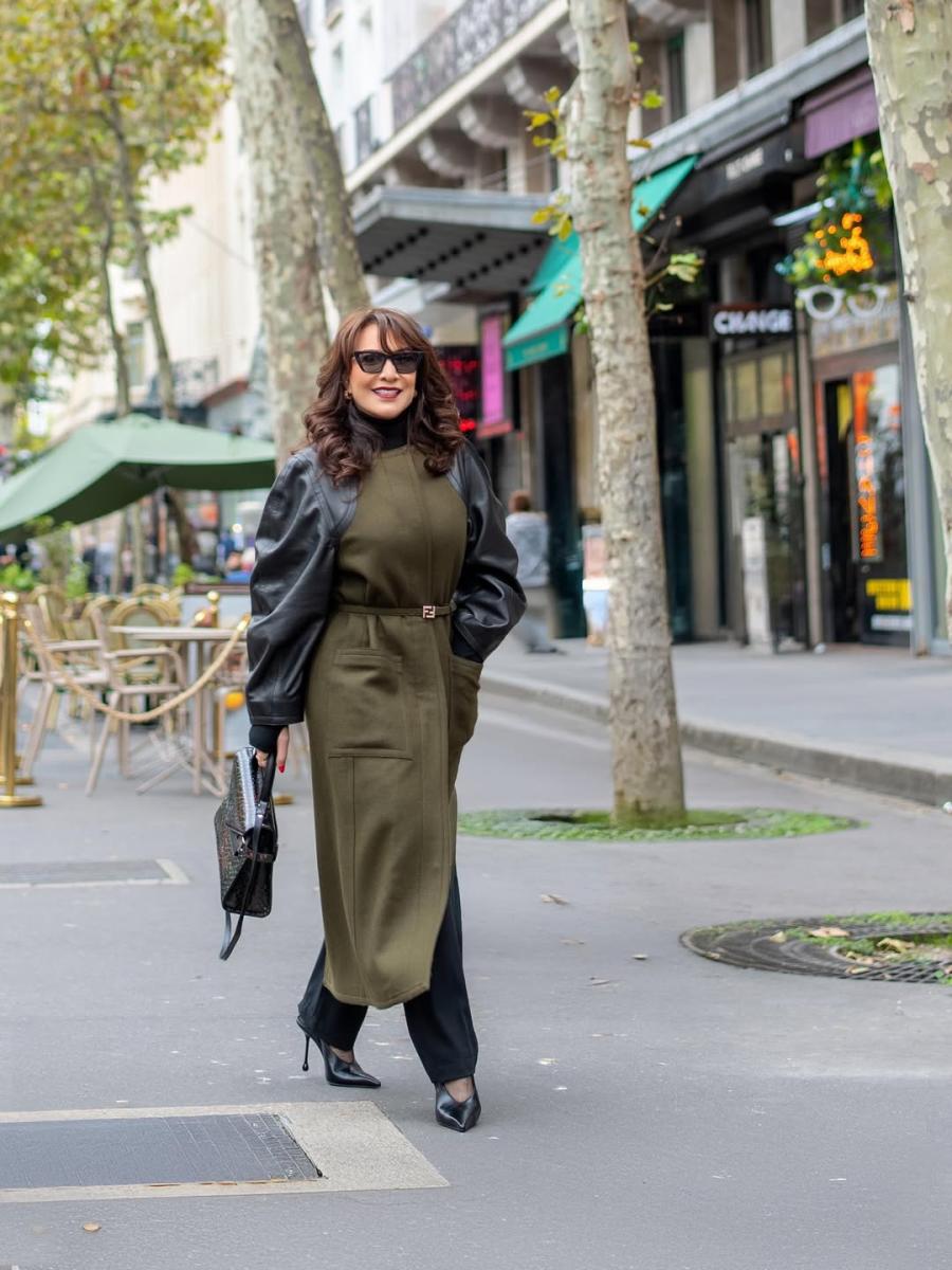 في إحدى إطلالاتها، تألقت بجاكيت جلد أزرق مزوّد بحزام على الخصر، نسقته مع بنطلون أسود كلاسيكي وحذاء بنقشة الليوبارد، فيما أضافت حقيبة Tote لامعة ونظارات سوداء كبيرة لمسة عصرية جريئة.
