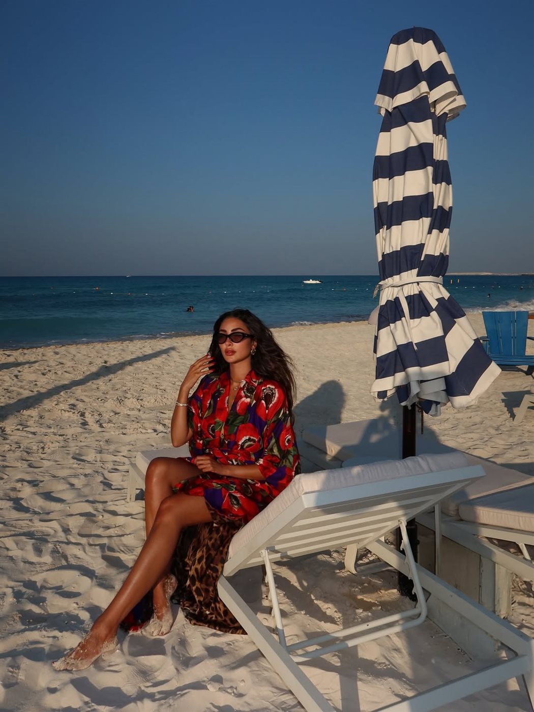 كما خطفت نور الغندور الأنظار مؤخرًا بإطلالة صيفية مفعمة بالألوان خلال جلسة تصوير على أحد الشواطئ، ارتدت فيها فستان كيمونو واسع مزينًا بنقشات ورود كبيرة باللونين الأحمر والأخضر على خلفية زرقاء ملكية، ما منحها حضورًا لافتًا يناسب أجواء الصيف.