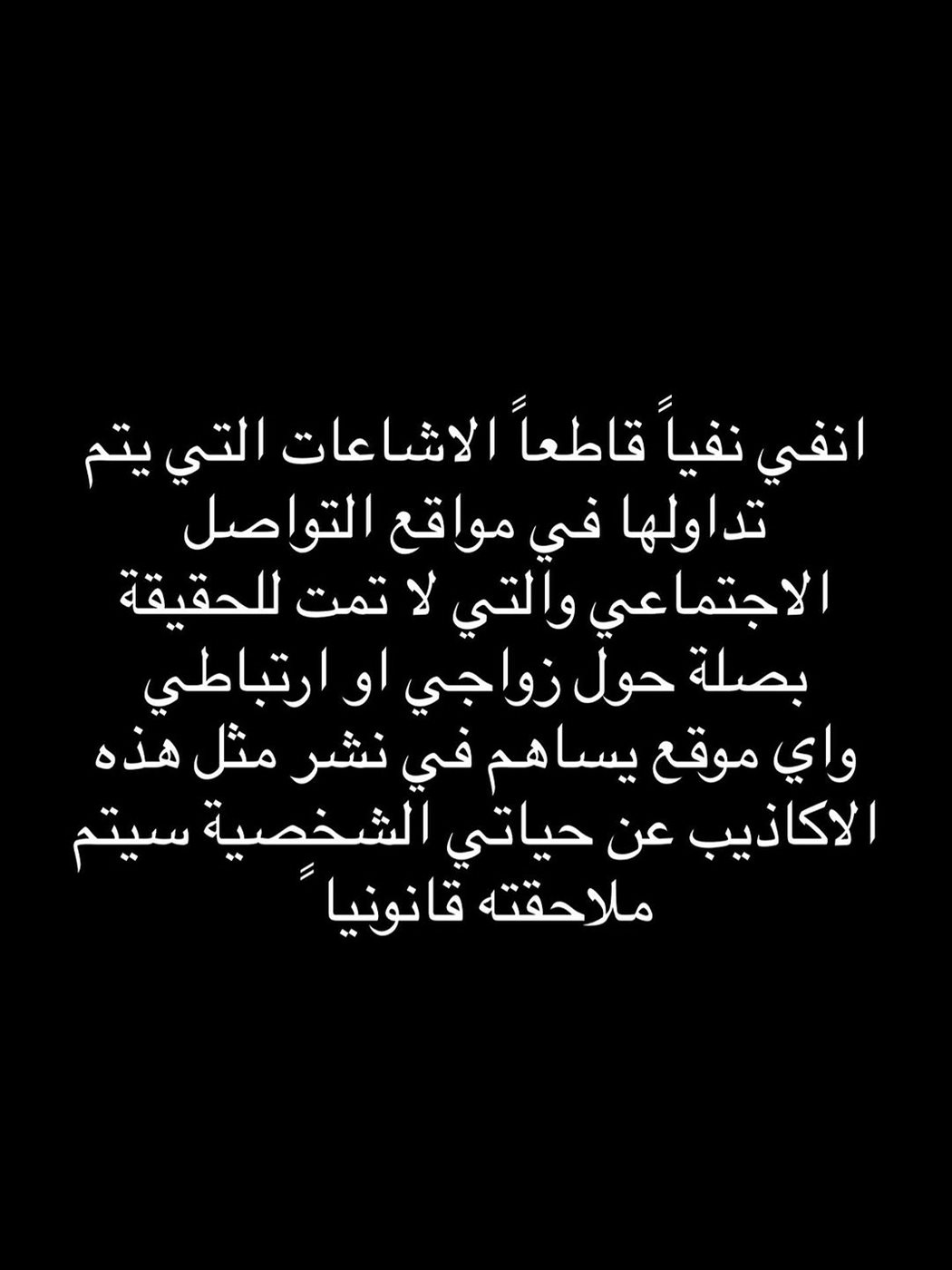 ونشرت زينب فياض بيانًا عبر حسابها الرسمي على موقع “إنستجرام”، نفت فيه تلك الأنباء بشكل قاطع، قائلة: “أنفي نفيًا قاطعًا الشائعات التي يتم تداولها في مواقع التواصل الاجتماعي، والتي لا تمتّ للحقيقة بصلة، حول زواجي أو ارتباطي. وأي موقع يساهم في نشر مثل هذه الأكاذيب عن حياتي الشخصية سيتم ملاحقته قانونيًا”.