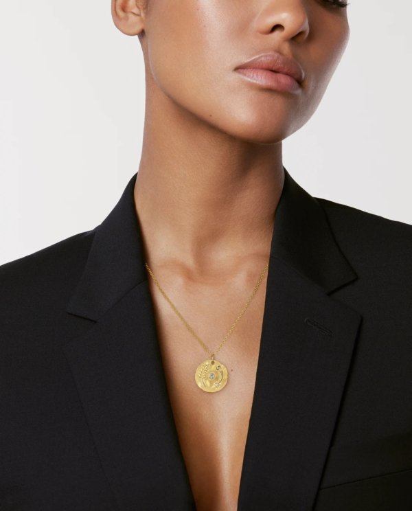 وتختم شانيل الفصل بميدالية Médaille Talismans من مجموعة Chance de Chanel، المصنوعة من الذهب الأصفر عيار 18 قيراطاً والمرصّعة بماستين لامعتين.