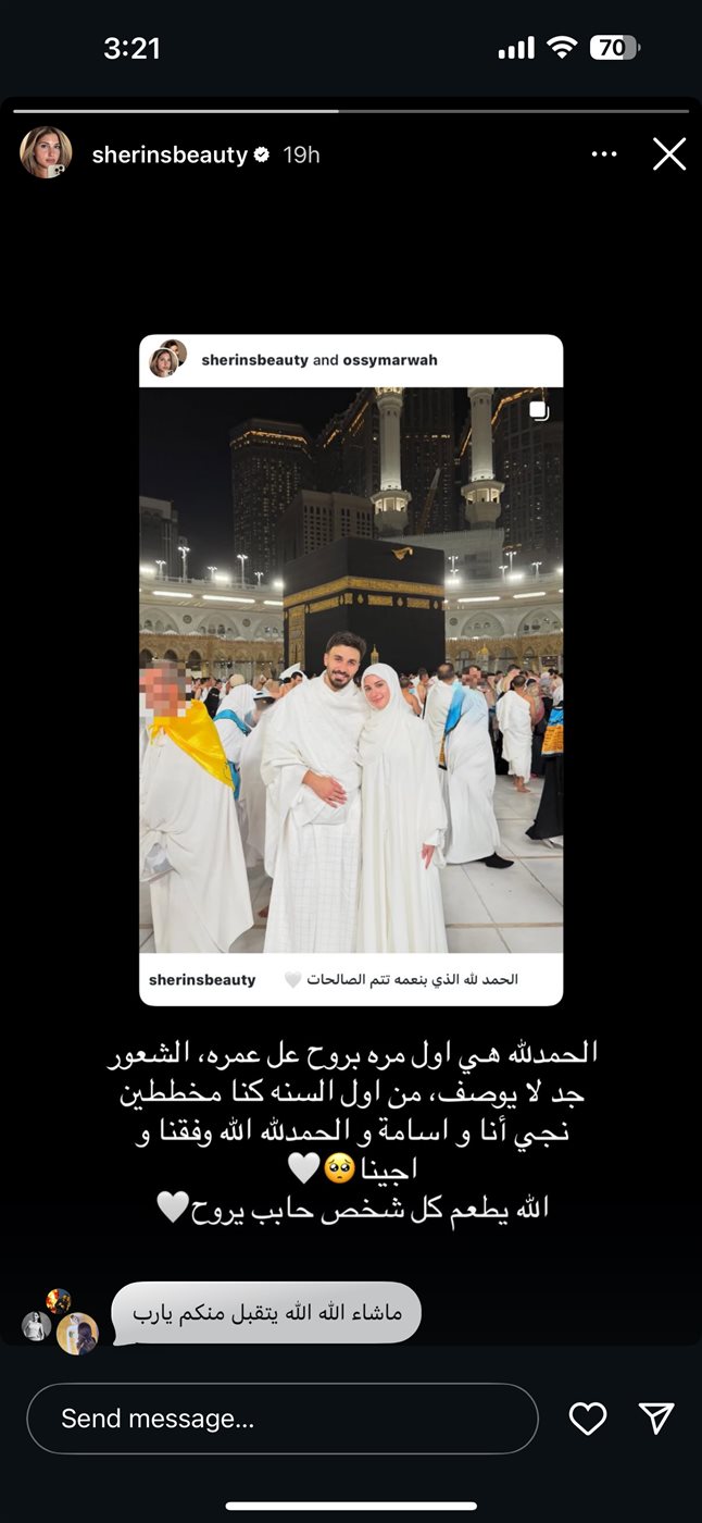 كما أرفقت شيرين الصور بتعليق مؤثر قالت فيه: “الحمد لله، هي أول مرة بنروح على عمرة، الشعور جد لا يوصف… من أول السنة كنا مخططين نجي أنا وأسامة، والحمد لله الله وفقنا وأحيانا الله يطعم كل شخص حابب يروح.”