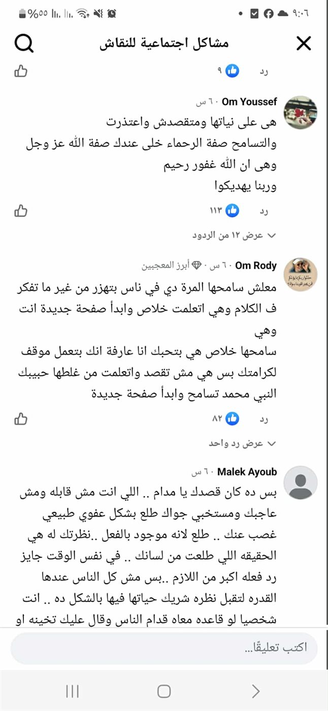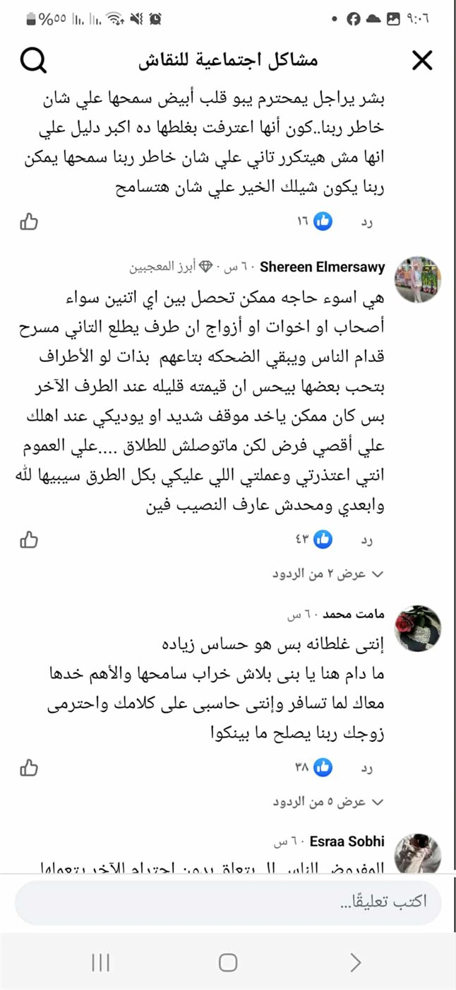 جاءت كل التعليقات راجيه منه أن يسامحها حيث أكدت "أ.ي" أن صاحبة المشكلة لا تقصد ما قالته والتسامح صفة الرحماء، أما "أ.ر" فترى أن الزوج اتخذ هذا الموقف حفاظًا على كرامته وأن ما حدث تعلمت منه الزوجة فلا داعي للاستمرار في ذلك الطلاق.