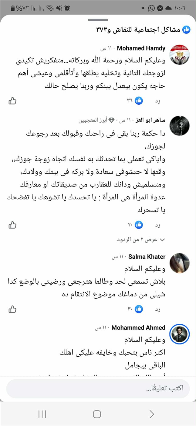 استهلت "ذ.ا" تعليقها بقوله تعالى "ولا يحيق المكر السئ إلا بأهله" وأن الأفضل لها أن تفكر بحياتها لا بأذية المرأة لآخرى وبما أنها قد عادت لبيتها فعليها بالرضا بالوضع الحالي ولا تسأل زوجها طلاق للأخرى.