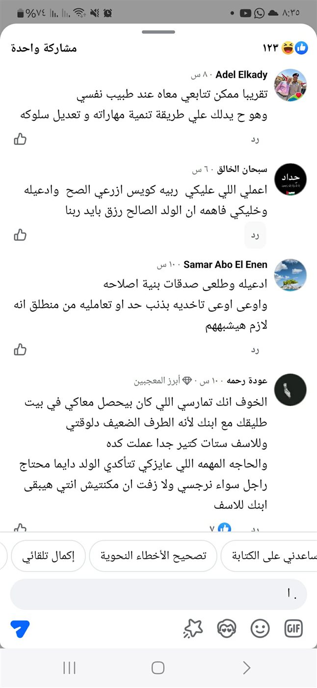 أكدت "ح.م" على أنه لا يوجد أحد يستطيع أن يُجزم لكي هل سيكون إبنك هكذا أم لا، فقط إحرصي أنتِ على تربيته وتعليمه وإجعليه ملتزم في صلاته ودينه، وطلبت منها أن تُهدء من توترها لأن هذا سيؤذي إبنها.