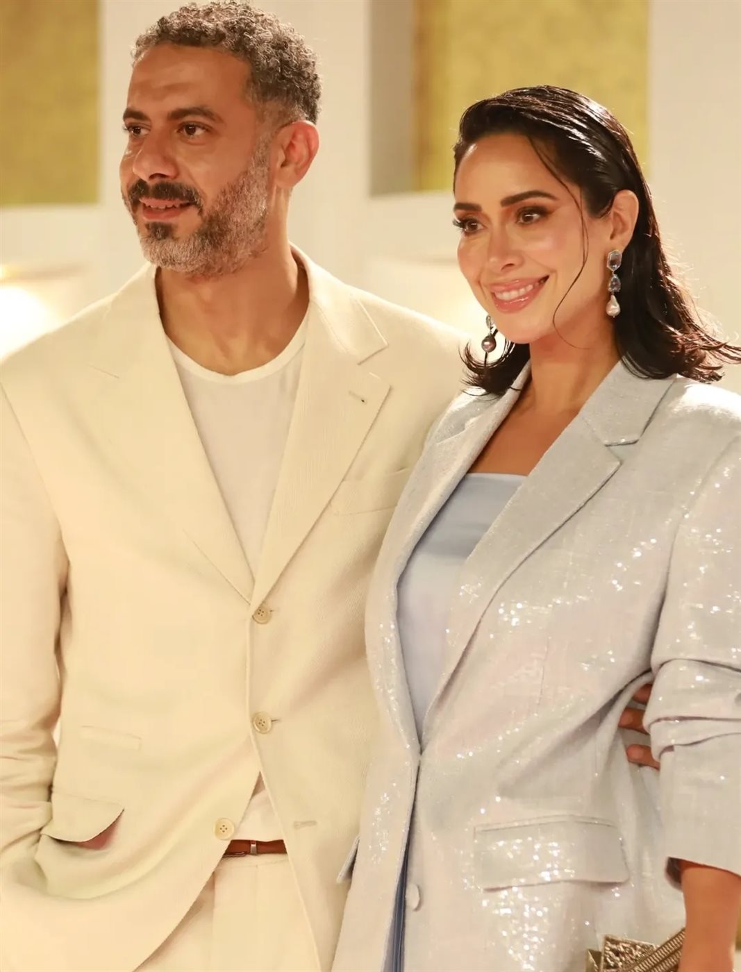 أما بسنت شوقي، فاختارت بدلة لامعة باللون الأزرق الفاتح ذات تصميم فضفاض، ونسّقتها مع توب بنفس اللون وحقيبة صغيرة لامعة. وبدت أنيقة بتسريحة الشعر المبلل ومكياج ناعم يوازن بين الجرأة والبساطة.