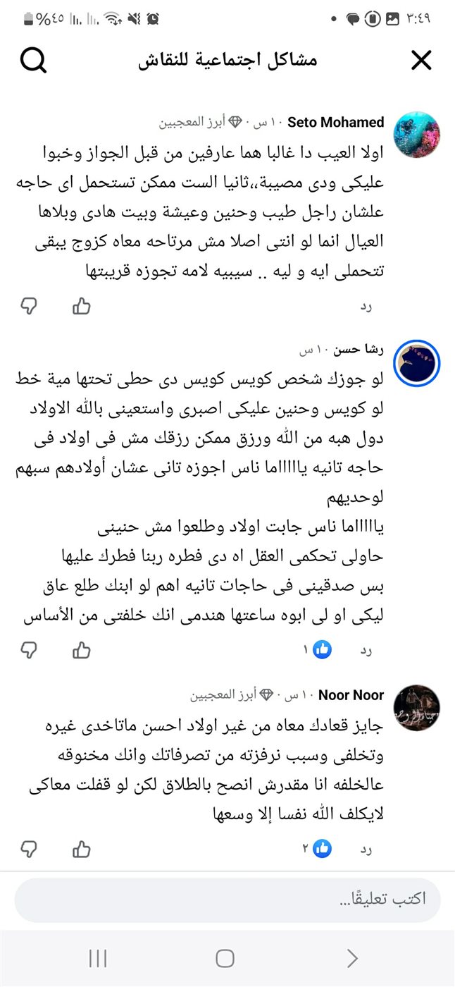 علقت "ن.ا" موضحة أن الزوج ليس لديه ما قد يجعل زوجته تُضحي من أجله وتبقى معه، لتدعو لها في النهاية بأن يرزقها الله الذرية الصالحة ويُلهمها القرار الصحيح.