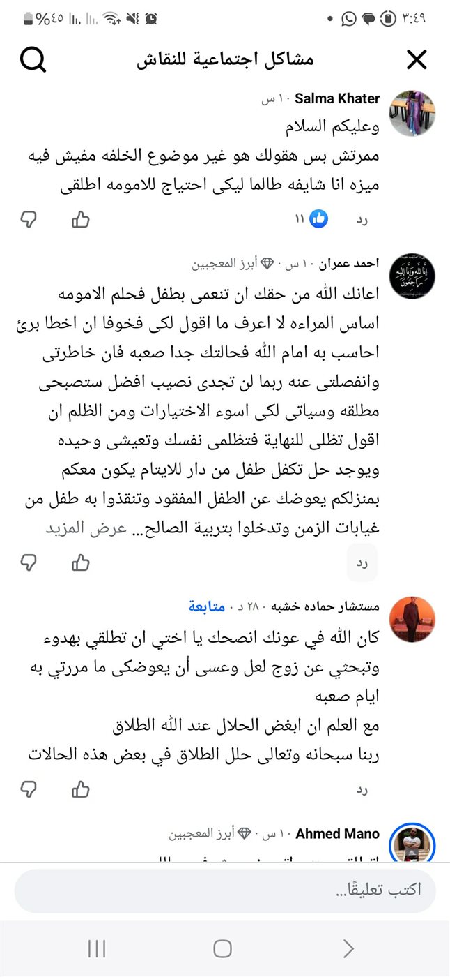 كما نصحها "أ.ع" بأن تكفل طفل يتيم يعوضها عن حلم الأمومة وتكون قد أنقذته من مستقبل مجهول كان ينتظره، حيث يرى أن النُصح بالإنفصال أو الإكمال قد يكون خطأ فلربما لن تجد من هو أفضل بعد الطلاق ومن الظلم أن يتم النُصح بأن تُكمل مع زوجها الحالي وتنسى حلم الأمومة.
