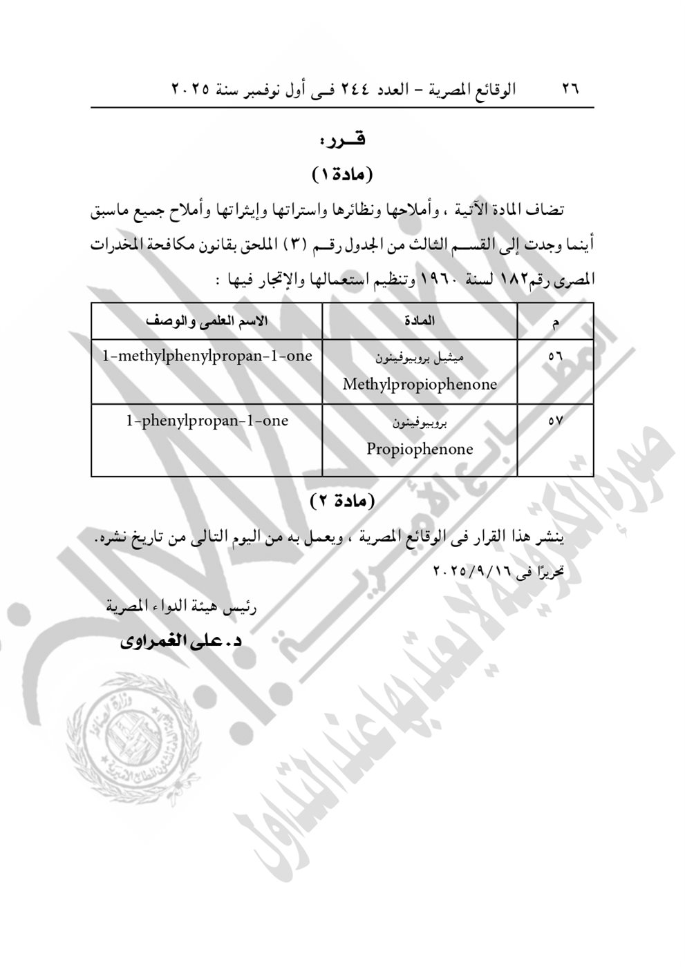 وجاء في المادة الأولى لقرار هيئة الدواء المصرية "تضاف المادة الآتية: methylphenylpropanone میثیل پروبیوفینون.. phenylpropan-1-one.. Methylpropiophenone، بروبيوفيتون Propiophenone" وأملاحها ونظائرها واستراتها وإيثراتها وأملاح جميع ماسبق أينما وجدت إلى القسم الثالث من الجدول رقم (۳) الملحق بقانون مكافحة المخدرات المصرى رقم ١٨٢ لسنة ١٩٦٠ وتنظيم استعمالها والاتجار فيها".