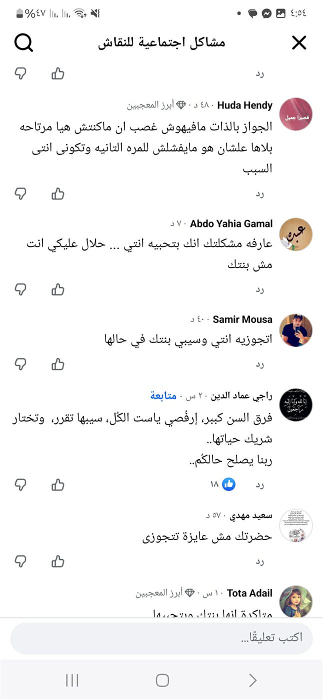 وبسخرية علقت "م.م" "اتجوزيه أنتي طالما عاجبك شكله"، وطلبت منها أن تترك إبنتها تختار من هم في سنها ومناسبين لها، كما تعجبت "م.ع" من طريقة تفكير الأم في اختيارها لرجل مطلق ومعه أبناء لإبنتها.
