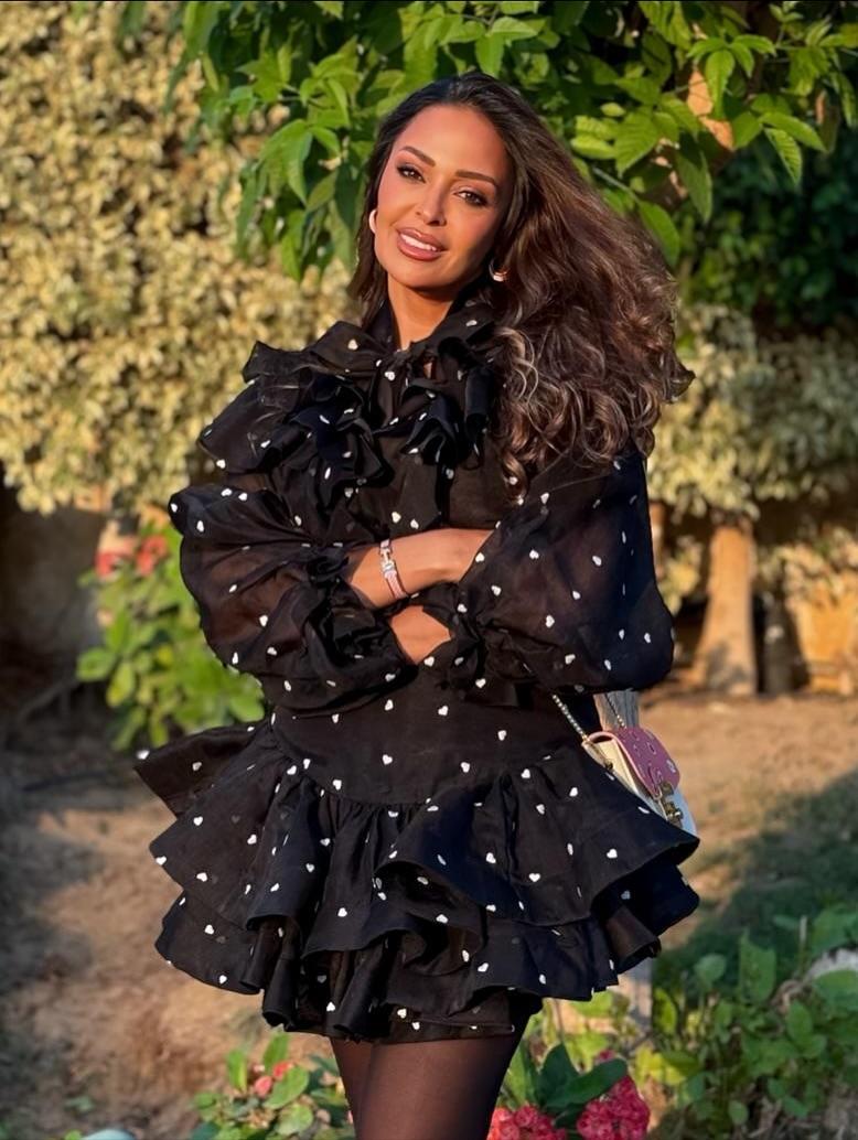 اختارت داليا البحيري فستانًا قصيرًا باللون الأسود المنقّط بالأبيض، تزيّنه طبقات من الكرانيش التي أضفت على الإطلالة لمسة من الحيوية والأنوثة. وتميّز الفستان بأكمامه الواسعة المنتفخة، مانحًا إياها مظهرًا أنيقًا وعصريًا في آنٍ واحد.