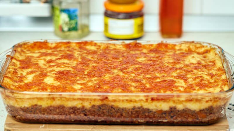 حضّري طبق بايركس وادهنيه بالزبدة، ثم وزعي خليط اللحم في القاع، وفوقه طبقة من البطاطس المهروسة، ثم صبّي البشاميل فوق طبقة البطاطس بالتساوي.