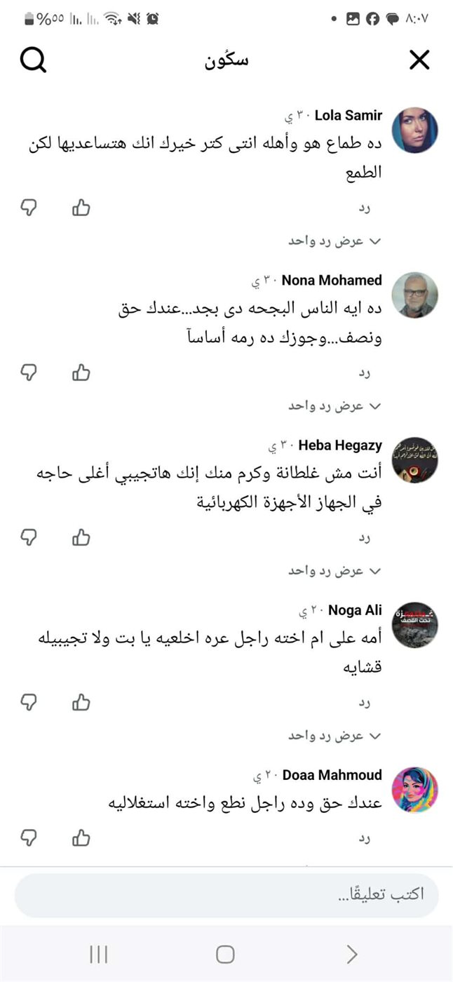 وعلقت "أ.ي" موضحه أن أخته مسئولة منه وليس من صاحبة المشكلة، وطلبت منها "ج.ا" أن تظل على موقفها وأنه سيرضى رغمًا عنه بالأمر الواقع، وتسألت "آ.د" في تعليقها عن ما الذي حدث للرجال؟