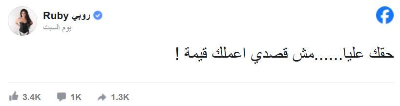 أشعلت المطربة روبي مواقع التواصل الاجتماعي خلال الساعات الماضية بعد نشرها مجموعة من التدوينات الغامضة عبر حسابها الرسمي على فيسبوك، من بينها: «حقك عليّا.. مش قصدي أعملك قيمة» و«العيب عليّا وعلى قراراتي الغشيمة»، من دون أي توضيح، ما أثار حالة من الجدل والتكهنات بين متابعيها.