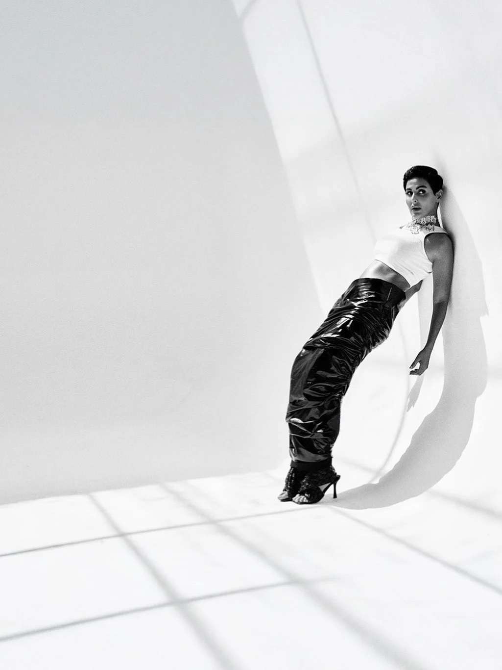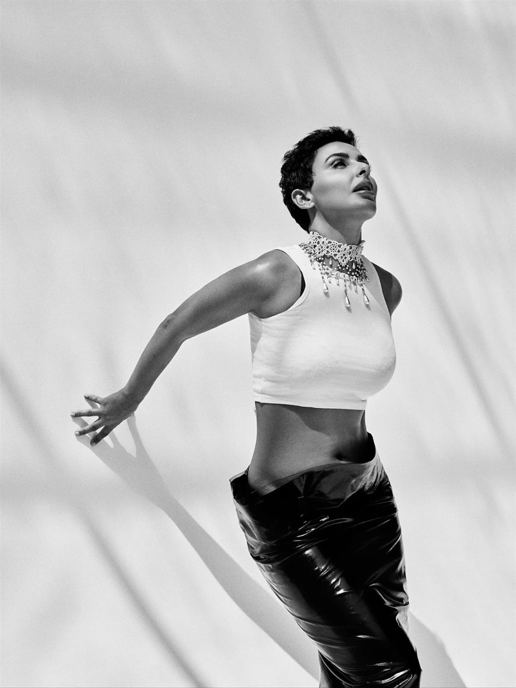 ظهرت ميس حمدان في الصور مرتدية توب أبيض قصير بلا أكمام، نسقته مع بنطلون أسود لامع بتصميم فريد مصنوع من خامة تشبه الجلد الصناعي أو الفينيل، يلتف حول الساقين بطريقة مبتكرة.