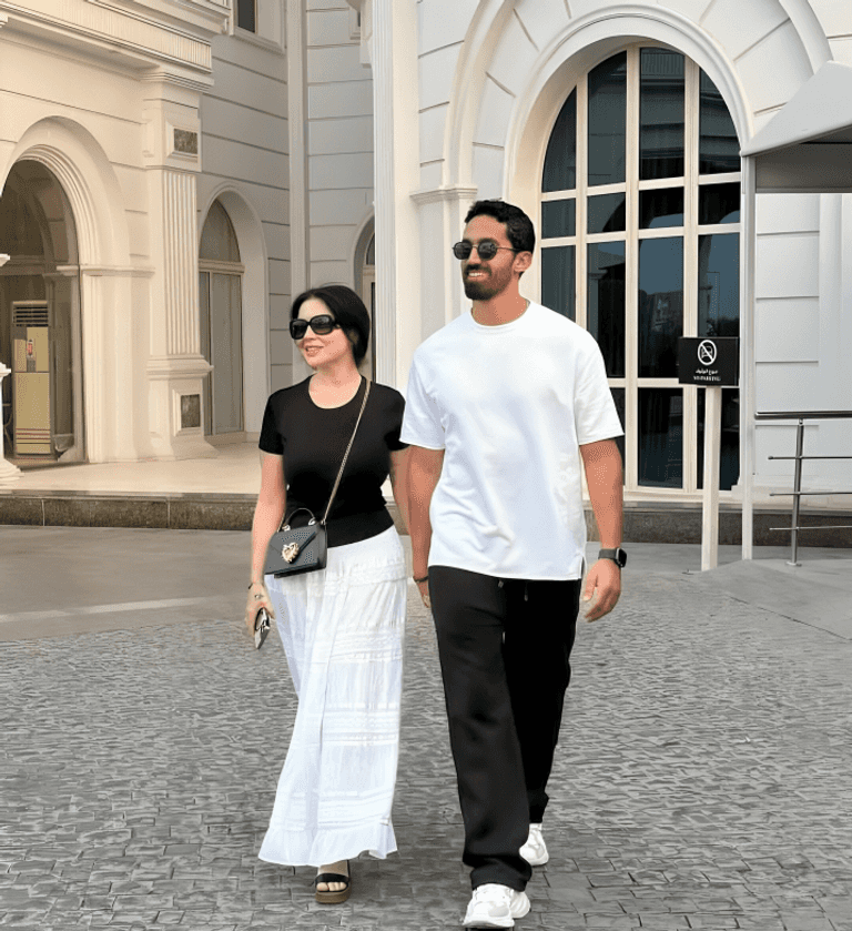 وظهرت مي عز الدين في الصور بإطلالة بسيطة وأنيقة، حيث ارتدت تنورة بيضاء مع قميص أسود ونظارة شمسية، بينما ظهر مرافقها بإطلالة كلاسيكية متناسقة.