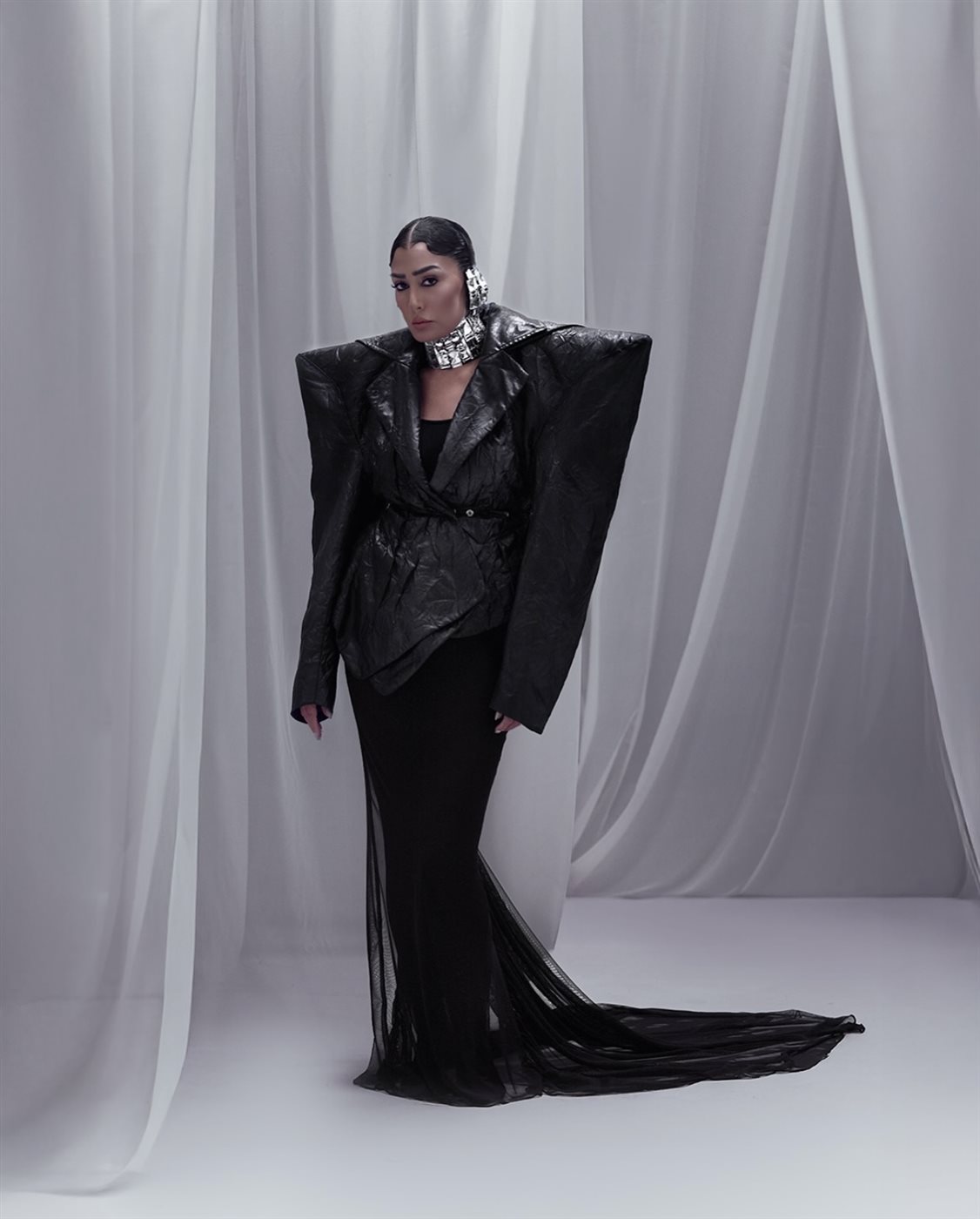 اختارت غادة عبد الرازق جاكيتًا أسود من الجلد الفاخر يتميز بتصميم مبتكر وكتفين عريضتين يمنحان الإطلالة طابعًا دراميًا قويًا، بينما نسّقته مع تنورة ضيقة طويلة مزينة بتفاصيل شفافة في الجزء السفلي، امتدت كذيل أنيق يضفي لمسة من الغموض والجاذبية.