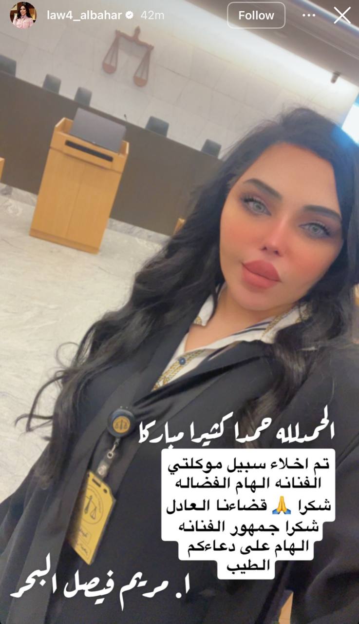 ونشرت البحر مقطع فيديو من داخل قصر العدل في الكويت عبر حسابها على سناب شات، شكرت فيه كل من ساندهم خلال القضية، قائلة: “كل الشكر لكل شخص حاول أن يخفف عنا هذه الأزمة، والشكر موصول لجمهور إلهام الفضالة.”