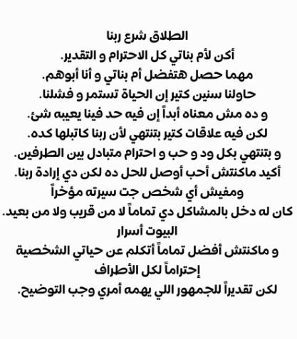 ونشر كريم عبر خاصية “الستوري” على حسابه الرسمي في إنستغرام صورة كتب فيها: “الطلاق شرع ربنا، أكنّ لأم بناتي كل الاحترام والتقدير، ومهما حصل هتفضل أم بناتي وأنا أبوهم. حاولنا سنين كتير إن الحياة تستمر وفشلنا.”