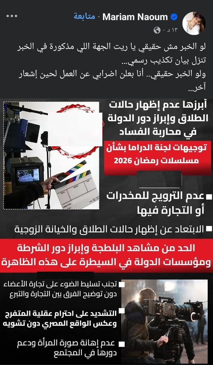 وكتبت مريم نعوم: “لو الخبر مش حقيقي يا ريت الجهة اللي مذكورة في الخبر تنزل بيان تكذيب رسمي، ولو الخبر حقيقي.. أنا بعلن إضرابي عن العمل لحين إشعار آخر.”