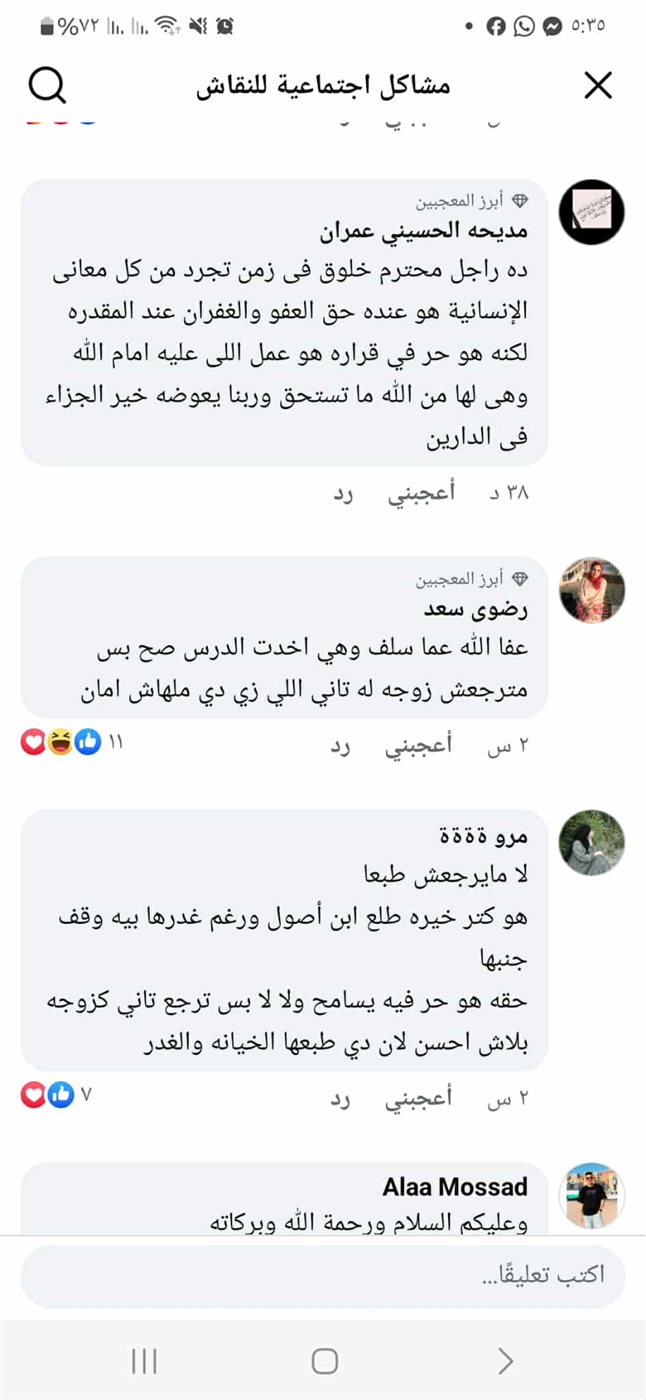 علقت "أ.أ" بأن الزوج معه حق في عد مسامحتها، موضحة بأن العفو عند المقدرة ليس معناه أن يسامح في الأذى الذي تعرض له، لتختتم تعليقها بالدعاء له بأن يجبر الله قلبه ويعوضه خير.