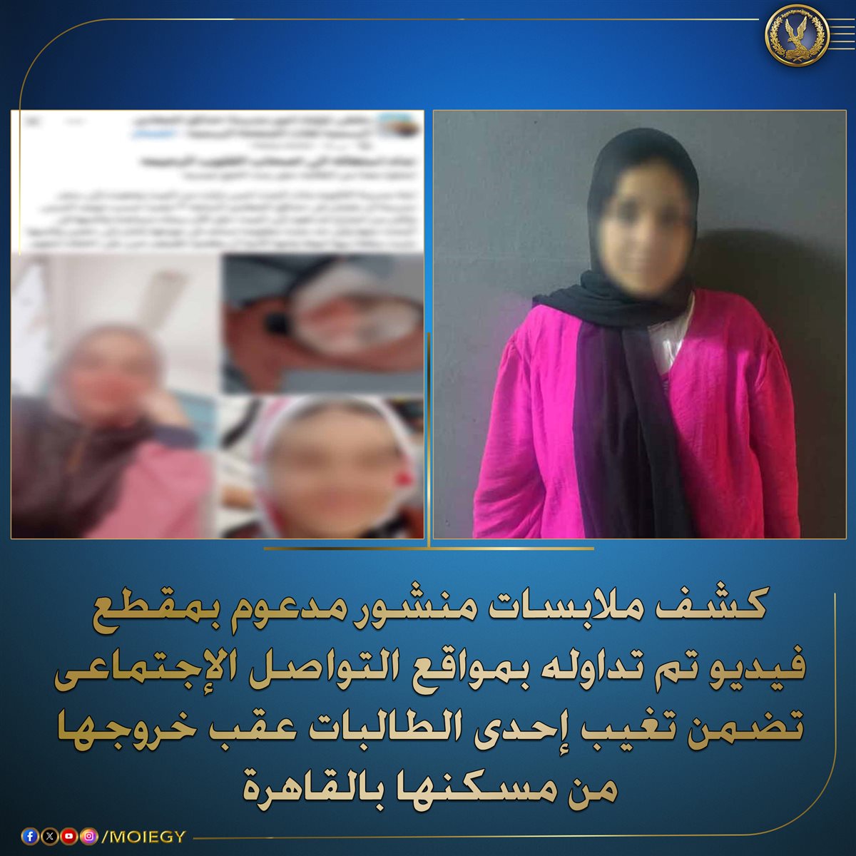 أعلنت وزارة الداخلية، في بيان لها، تفاصيل واقعة تغيّب إحدى الطالبات بمحافظة القاهرة، وذلك عقب تداول منشور مدعوم بمقطع فيديو عبر مواقع التواصل الاجتماعي يفيد باختفائها بعد خروجها من مسكنها.