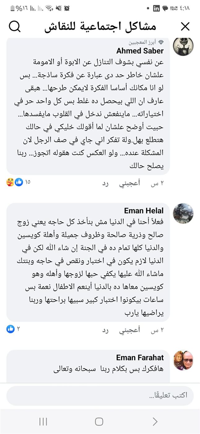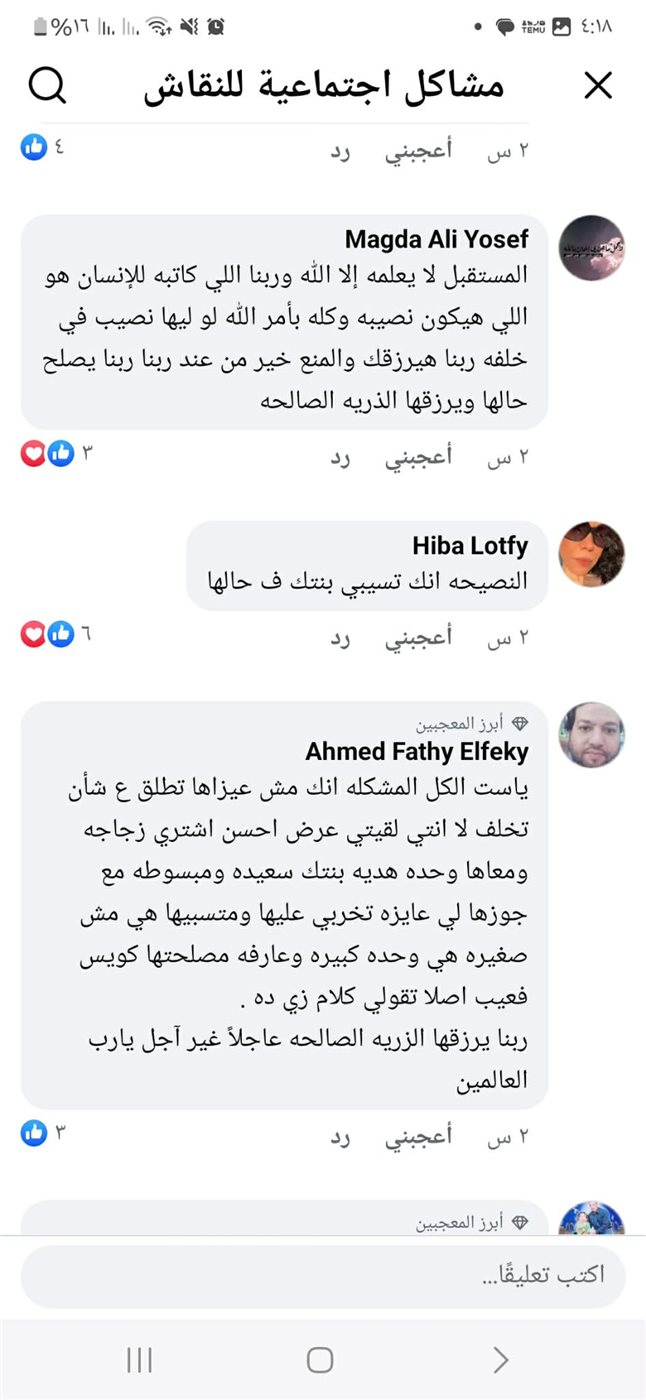 أكدت "ك.خ" من خلال تعليقها بأن الله هو مقسم الأرزاق ولكل منا واحد صحيح وليس واحد إلا ربع وأن الرضا بالمقسوم عبادة، كما طلب "ع.أ" من الفتاة أن لا تسمح لوالدتها بالتدخل في حياتها ولا تستمع لكلامها ولكن عليها أن تعاملها بكل الأدب والاحترام.
