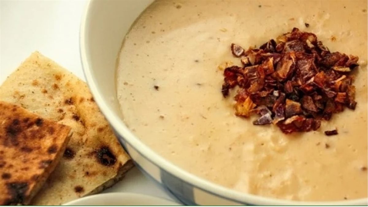 5. يوضع الدقيق ومعلقة زبدة على النار ويقلب قليلًا، ويرفع بعد عن النار ويترك ليبرد، ثم يضاف علبة الزبادي ويقلب جيدًا.