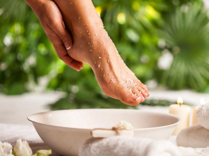 وضع القدمين في الماء والملح ويفضل ان يكون ملح البحر من الخطوات الهامة لتنظيف القدمين يوميًا بانتظام، حيث يمنع تراكم الجلد الميت وكذلك يحمي بشرتك من الجفاف والتقشير.