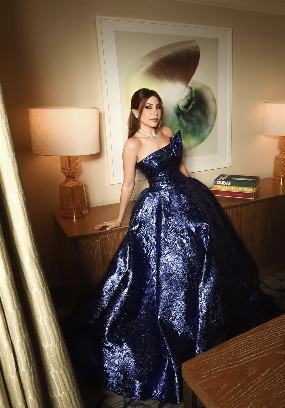 تألقت يارا على السجادة الحمراء بفستان أزرق معدني لامع بتصميم منفوش يحمل لمسات درامية أنيقة. الفستان المبرقش يعكس الضوء بطريقة آسرة، وجاء بقصة كتف واحد تمنح الإطلالة توازناً بين الجرأة والرقي، وهو من توقيع المصممة نور فتّح الله من دار Maison 7 Dubai، وهي من الأسماء الصاعدة التي لفتت الأنظار في إطلالات النجمات في المنطقة.