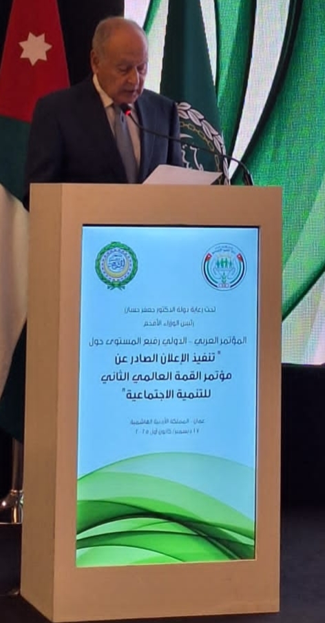 جاء ذلك في كلمته خلال افتتاح أعمال المؤتمر العربي رفيع المستوى حول تنفيذ الإعلان الصادر عن مؤتمر القمة العالمي الثاني للتنمية الاجتماعية، والذي عُقد في المملكة الأردنية الهاشمية، في 17 ديسمبر 2025، بمشاركة عربية ودولية واسعة.