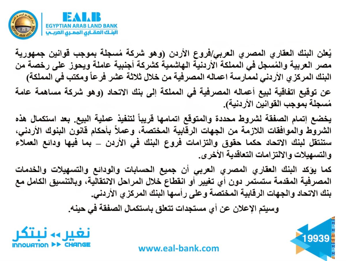 يُعلن البنك العقاري المصري العربى/فروع الأردن (وهو شركة مُسجلة بموجب قوانين جمهورية مصر العربية والمُسجل في المملكة الأردنية الهاشمية كشركة أجنبية عاملة ويحوز على رخصة من البنك المركزي الأردني لممارسة اعماله المصرفية من خلال ثلاثة عشر فرعاً ومكتب في المملكة) عن توقيع اتفاقية لبيع أعماله المصرفية في المملكة إلى بنك الاتحاد (وهو شركة مساهمة عامة مُسجلة بموجب القوانين الأردنية).