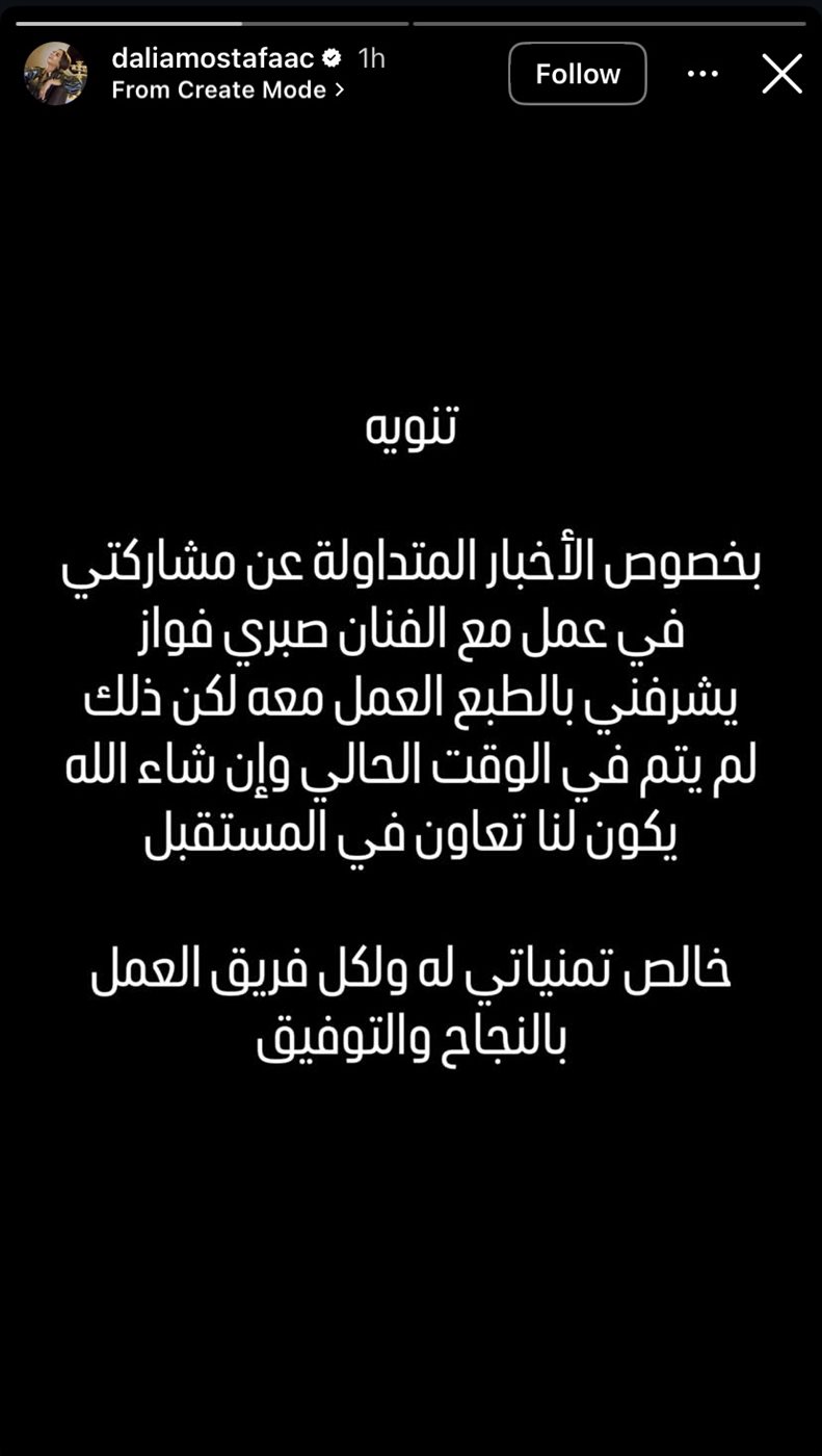 ومن خلال بيان رسمي نشرته عبر حسابها على موقع «إنستجرام»، أوضحت داليا قائلة: «يشرفني بالطبع العمل مع صبري فواز، لكن ذلك لم يتم في الوقت الحالي، وإن شاء الله يكون لنا تعاون في المستقبل»،