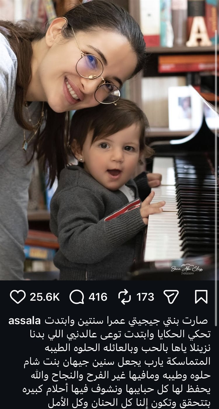 حيث قالت فيها: “صارت بنتي جيجيتي عمر سنتين وابتدت تحكي الحكايا وابتدت توعى عالدنيي اللي بدنا نزينلا ياها بالحب وبالعائله الحلوه الطيبه المتماسكة.”