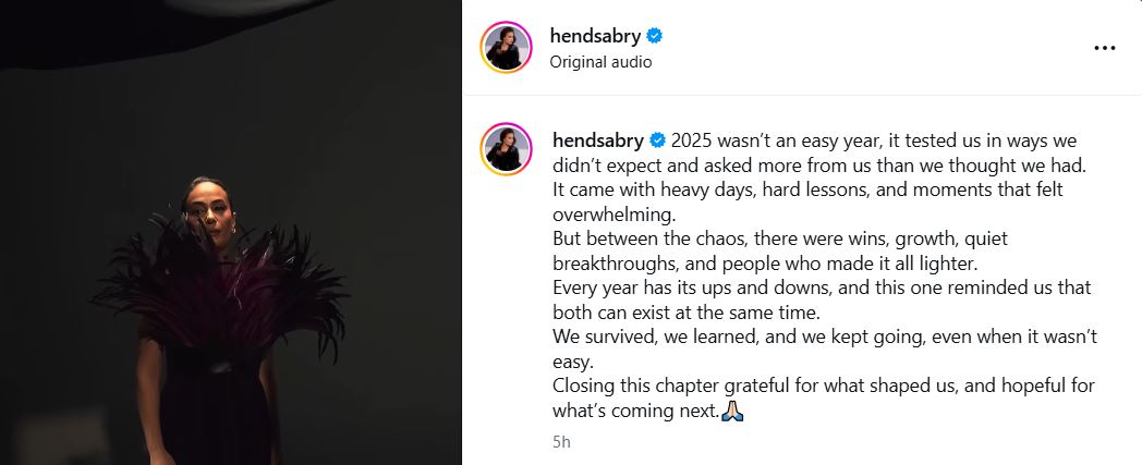 وتابعت هند صبري حديثها بنبرة مليئة بالأمل قائلة: «كل عام يحمل صعوده وهبوطه، وهذا العام ذكرنا أن الاثنين قد يتواجدان في الوقت نفسه. لقد نجونا، وتعلمنا، واستمررنا في المضي قدمًا، حتى عندما لم يكن الطريق سهلًا. نغلق هذا الفصل بامتنان لما شكّلنا، وبثقة فيما يحمله القادم لنا».