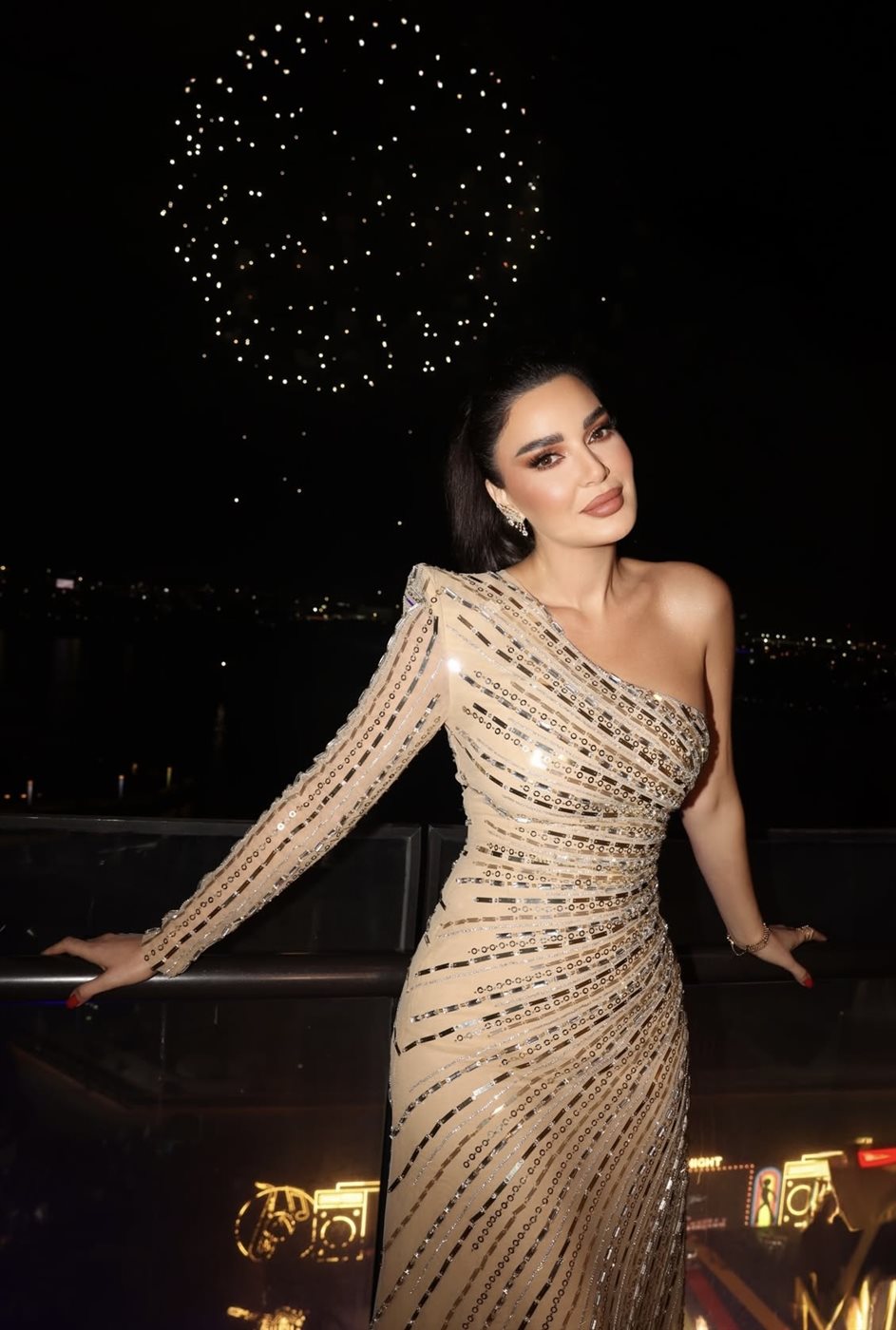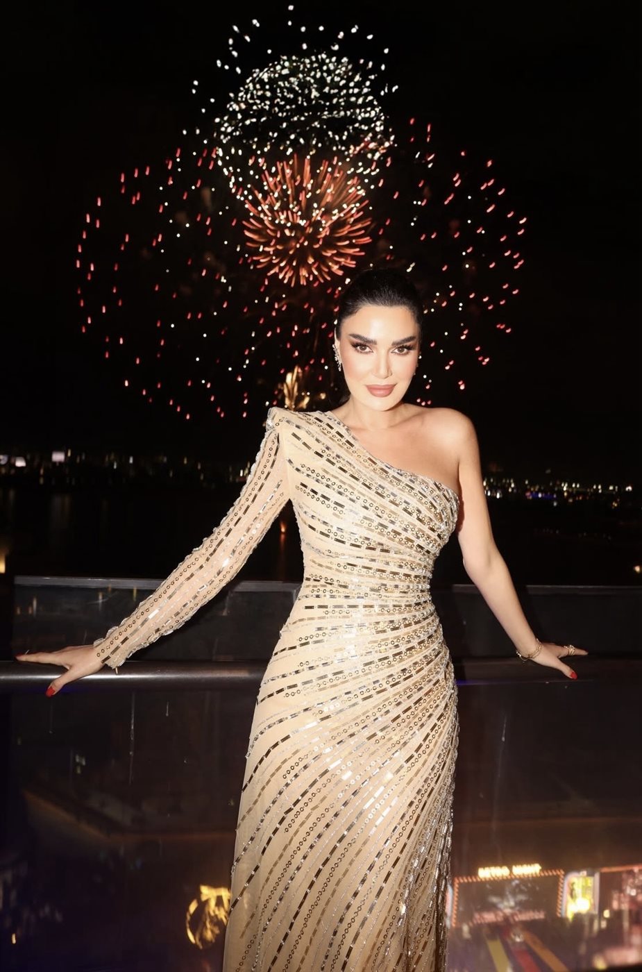 وفي التفاصيل، اختارت سيرين عبد النور فستانًا ذهبيًا لامعًا بتصميم أنثوي راقٍ من توقيع طوني ورد، جاء بقصة الكتف الواحد مع كم طويل منسدل، ما منح الإطلالة توازنًا متناغمًا بين الجرأة والرقي. وانسدل الفستان بانسيابية على القوام، مزدانًا بتطريزات وخطوط براقة عكست الضوء بنعومة، لتتناغم مع بريق الألعاب النارية في الخلفية.